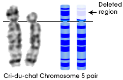 Cri-Du-Chat is a genetic disorder that is caused when parts (genes) of chromosome 5 are missing, which usually causes mental retardation and other health problems. This disorder is not related with any specific ethnic background. In other words people of any ethnicity could be born with this disorder. Cri-Du-Chat is not inherited in most cases.