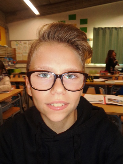 Hi! I’m 11 years old. I’ve got short, blonde hair and blue eyes. I’ve got three sisters. My dad works in a shop. My mum works in a shop, too.