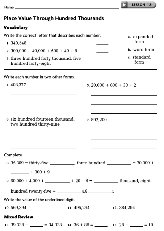 In the place-value system, each place is ten times as great as the place to its right. To write a number in word form, write the number in each period and follow it with the name of the period. Do not name the ones period. Remember to use commas to separate each period of numbers. 367,412 is three hundred sixty-seven thousand, four hundred twelve. Directions: Please drag the above icon to your desktop, print, and complete. Turn in the assignment once you have completed it. |