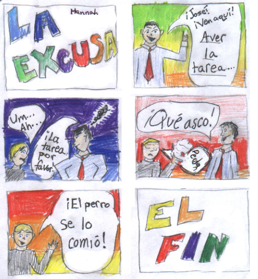 Design a Spanish comic strip or historieta that will illustrate one or more of the expressions on your vocabulary list. Decide what action will be taking place, how many frames you will need to convey the sequence (the comic strip should be at least two frames), and what each character will be doing and saying in each frame. Rough Draft: Write out the Spanish dialogue and narration that will appear in your comic strip and indicate in which frame. Hand in for corrections. Be sure that: 1. The situation illustrates one or more of the expressions on the list. Include at least one statement and at least one reaction to that statement. 2. Vocabulary is clear and simple enough that your classmates will understand without translation. You may use the dictionary or cupones but keep it simple. 3. The idea is original, clever, and/or humorous. example of a rough draft: Frame #1 Mother says to child “Levántate, son las seis de la mañana. Vamos a la escuela” Boy says, “Que pesado! Estoy enfermo, me duele la cabeza.” Frame #2: Mother says, “Cuánto lo siento. No puedes ir a la escuela hoy.” Child thinks, “Qué bueno!” After your rough draft has been handed back and corrected or revised, make your illustration with dialogue blurbs. |